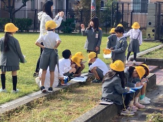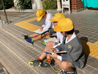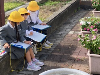 1年生の子どもたちが芝生広場で発見メモを書いていました。見つけたものを絵に描いたり文で書いたりしています。尋ねてみると、見つけたものを使って少し長めの文章を書くようです。国語の学習でした。花や草、虫などを見つけていました。さあ、このあと上手に文章を考えて書くことができるかな。あたたかい陽気の中、子どもたちものびのびしています。