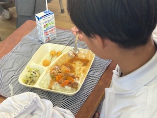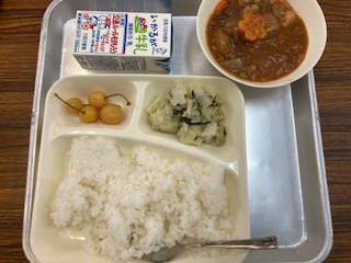 今日の給食のメニューは、ハヤシライス、キャベツのひじきドレッシング、さくらんぼ(缶)、牛乳、でした。ハヤシライスはまろやかでコクが感じられ、牛肉の旨みもしっかりと生かされていました。キャベツのひじきドレッシングは口あたりのよいさわやかな味のドレッシングがかかっていました。さくらんぼ(缶)は2個つながっているのを見つけて喜んでいました。