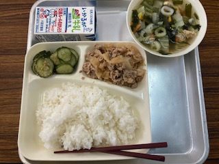 今日の給食のメニューは、豚肉のコチジャン炒め、鶏肉と春雨のスープ、きゅうりのナムル、牛乳、ごはん、でした。豚肉のコチジャン炒めは豚肉と大根を使用した炒め物で、にんにくで風味を加え、コチジャンで少し甘辛い味つけにしています。ごはんが進む味でした。鶏肉と春雨のスープは中華風で、彩りもきれいでした。きゅうりのナムルはごま油の風味が効いていておいしかったです。