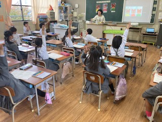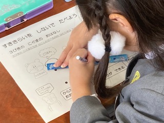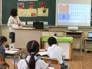 他校から栄養教諭に来てもらい、1年生の子どもたちに栄養指導を行いました。テーマは[すききらいをしないでたべよう]です。登場人物のクマさんたちはそれぞれ[ご飯][焼き魚][野菜の煮もの]を残してしまいました。これらの食べ物にはそれぞれどんなはたらきがあるのかな?先生がやさしく教えてくれました。これからは何でも好き嫌いなく食べましょうね。はーい!元気に答える1年生の子どもたちです。