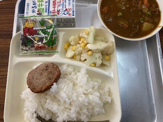 今日の給食のメニューは、ハンバーグカレーライス、カリフラワーのピクルス、豆こんぶ、牛乳、でした。ハンバーグカレーライスは名前の通り、ハンバーグがついています。かわいいサイズでした。牛肉の旨みが十分に生かされ、まろやかでコクのあるカレーでした。カリフラワーのピクルスはさっぱりとした口あたりで、コーンの甘さがアクセントになっていました。豆こんぶは一人一袋です。