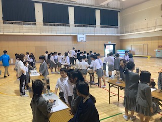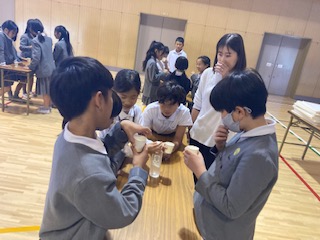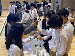 柴島浄水場にある水道記念館の方々に来ていただき、4年生の子どもたちに[出前水道教室]を行いました。まずはじめに大阪市にある浄水場やその中の施設、水道水ができるまでの大まかな流れなどを映像を見ながら教えていただきました。次に浄水処理の参加型実験です。グループ毎に手順を教えてもらいながら、水をきれいにしていきます。段階を重ねて水がきれいに透明になっていくようすに子どもたちも喜んでいました。最後には市販のミネラルウォーターと水道水の飲み比べもしました。大阪市の水道水は安全でおいしいことを知りました。子どもたちが疑問に思ったり知りたいと思ったことにも答えていただきました。