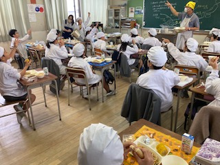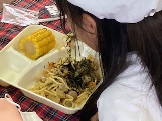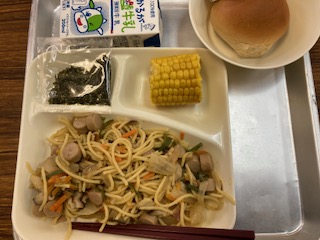 今日の給食のメニューは、ウインナーときのこの和風スパゲッティ、焼きとうもろこし、固形チーズ、牛乳、パン、でした。ウインナーときのこの和風スパゲッティはウインナーとベーコンと一緒に季節の食材の椎茸としめじが使われていました。その他にも細かくていねいに刻まれたにんじんやたまねぎ、ピーマンが入っていて醤油ベースの和風味に仕上げています。焼きとうもろこしは自然の甘さを感じました。一気にかじって食べる子が大半ですが、一粒一粒ずつ食べる子も少数いるようです。固形チーズは1人1個です。