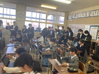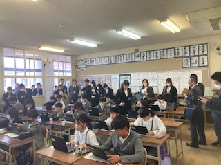 5時間目に2年生の国語の授業、6時間目に5年生の算数の授業を見てもらいました。2年生では説明文を読んで不思議に思ったことなどを一人一台端末を使って調べてワークシートにまとめたり、それを基に発表したりしていました。5年生は台形の面積の求め方を一人一台端末を使って自力解決できるように導いたり、結果について全体で交流したりしていました。普段から一人一台端末を積極的に活用するようにしているので、子どもたちもスムーズな流れで学習を進めることができていました。