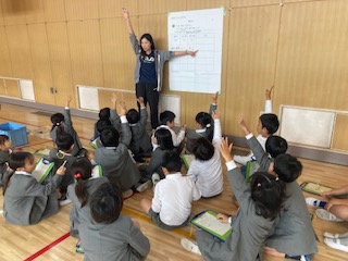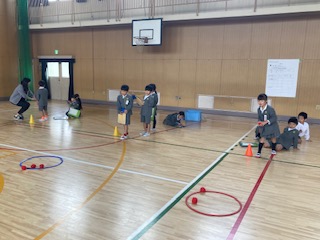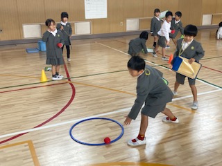 1年生の子どもたちが楽しく遊んでいます。的にしたフープの中をよく狙って赤玉を入れます。はいったぁーっ!…、子どもたちの喜ぶ声が講堂に響いています。1回目と2回目に入った数をたすと何個になりますか。算数の文章問題です。まずは記録を表にまとめて、次に式を書きます。自分の記録だけでなく、友だちの記録も表にまとめていきます。グループで協力しながら活動を進めることができていました。