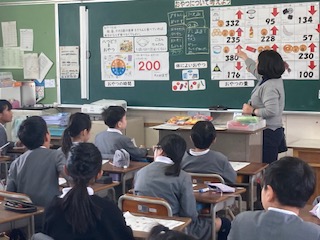他校から栄養教諭に来てもらい、4年生の子どもたちに栄養指導を行いました。テーマは[おやつについて考えよう]です。子どもたちは[おやつ]と聞くと目の色を変えて、○○が好き、△△がおいしい、□□をいつも買う…などなど、口々にうれしそうに話していました。一日に食べてもよいおやつのエネルギーは200kcalまでだそうです。子どもたちが普段よく食べているおやつは何kcalなのでしょうか。みんなで調べてみることにしました。さあ、結果はどうだったかな。今日から食べ方に変化が現れるでしょうか。楽しみです。