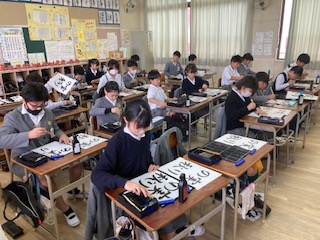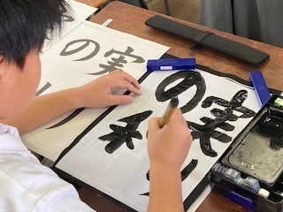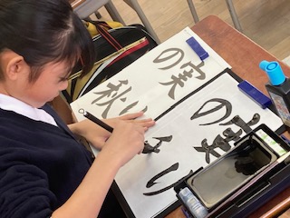 5年生の子どもたちが習字(毛筆)をしていました。お題は[実りの秋]です。お手本を見ながらていねいに筆を動かしていきます。しかし実りの秋はなかなか手強そうです。どの字も特徴的で、筆の動かし方が難しいようです。子どもたちもそう簡単には納得のいく一枚が書けないみたいで、先生に何枚も半紙をもらいにいっていました。最後まであきらめずに頑張ってくださいね。