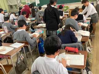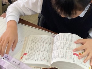 4年生の子どもたちが国語辞典を使って、[ごんぎつね]に出てきた言葉の意味を調べています。国語辞典の薄っぺらい紙がパサッパサッっとめくれる音が聞こえてきて、どことなく心地よい気がします。最近は授業の中でのパソコンの効果的な活用が強く求められていますが、こうやって地道に作業しながらの活動もやっぱりいいものですね。大切にしたいです。