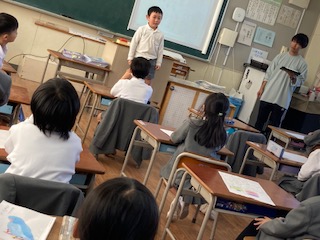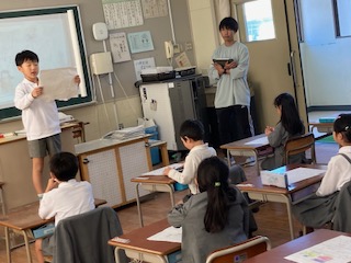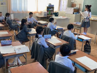 好きな教科を2つ選んでみんなの前で話しましょう。1年生の国語の授業です。自分で作文して、順番に発表していました。子どもたちはちょこんと発表台の上に乗ると笑顔になります。