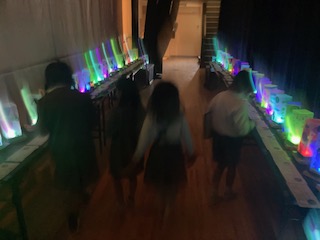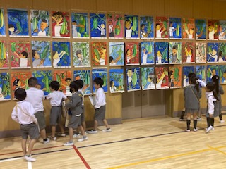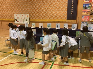 5時間目に1年生の子どもたちが作品展の鑑賞にやってきました。自分たちの作品を見た後は、お兄さんお姉さんたちの作品を見て回ります。