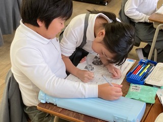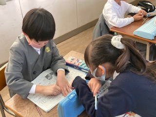 例えば↑のようなリズムをくり返して使ったり順番を並び替えて使ったりしながら、お祭りの音楽を作っていきます。2年生の子どもたちが友だちとペアになって音楽づくりをしていました。同じようなリズムに見えても実際に演奏してみると、違った音楽になるのでおもしろそうですね。朝から楽しそうな音色が聞こえてきました。