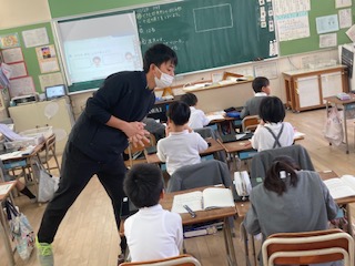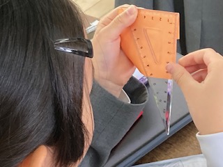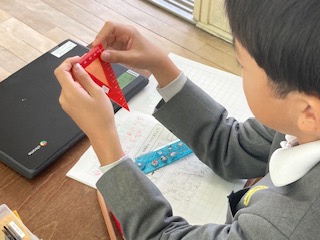 2年生の算数の授業です。子どもたちは[直角]という言葉を覚えました。本やノートのかどは直角です。三角定規の1つのかどは直角だよ。先生がおさらいをしていきます。今日は長方形について調べていました。長方形のかどはどうなっているかな。向かい合う辺の長さはどうなっているかな。子どもたちが三角定規を使って調べている様子をちゃんとできているか、先生が心配そうにのぞき込んでいます。大丈夫です。みんなちゃんとできていました。