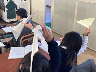 2年生の子どもたちがハサミを使ってチョキチョキ…、どんな形ができるかな。算数の授業です。長方形や正方形を対角線に沿ってハサミでチョキチョキ…。(ちなみに対角線はまだ習っていません。)三角形ができたよ!うん、どんな三角形ができた?直角が一つあるね。(直角は習っています。)1つの角が直角になっている三角形を[直角三角形]といいます。何か似ているもの見つけたよ!ん、何かな?…、三角定規です!