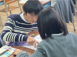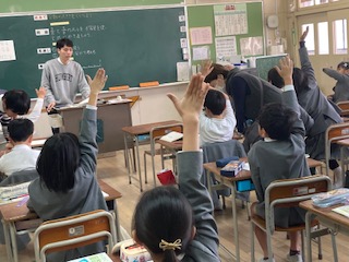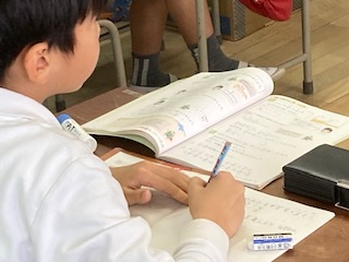 分数の大きさを比べましょう。3年生の子どもたちが算数の授業で分数の大きさの比べ方について学習していました。8分の3は8分の1が3つ分で、8分の5は8分の1が5つ分です。[等号]と[不等号]についても習いました。>、=、<を使って大小を表します。2人の先生で一人一人に寄り添いながら、ていねいに指導していきます。わからないところがあれば、進んで先生に聞きましょうね。