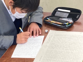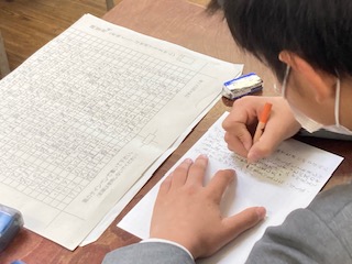今、6年生の子どもたちは卒業アルバムに載せる卒業文集に取り組んでいるところです。下書きも大体終わりに近づき、清書段階に入って大詰めを迎えています。2学期中に終わらせないといけないので、少しあわてています。あわてると間違ってしまうので集中しなければいけません。大変です。でも出来上がって先生に合格をもらったら、にこにこ笑顔になります。それを受けて、思わず先生もにこにこ笑顔です。卒業文集に取り組み様子も6年生ならではの光景です。