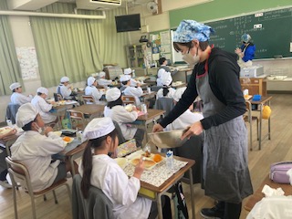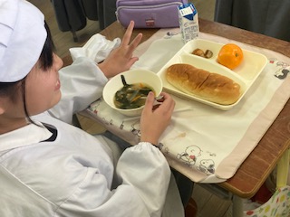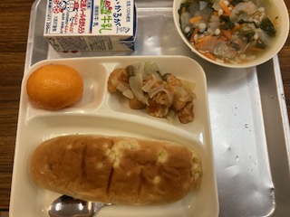 今日の給食のメニューは、さけのマリネ、肉だんごと麦のスープ、みかん、牛乳、パン、でした。さけのマリネはほどよい酸味がさっぱりとしていて、子どもたちにも評判がよかったです。肉だんごと麦のスープは肉だんごがやわらかく、旬の大根やにんじん、ほうれん草が入っていてやさしい味でした。押麦には食物繊維が多く含まれています。みかんは甘かったです。
