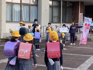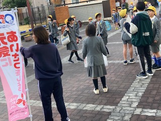 お互いにあいさつをし合う元気な朝の光景が見られました。気持ちよくあいさつをして、今日も一日頑張っていきましょう。同時に赤い羽根募金も行っています。