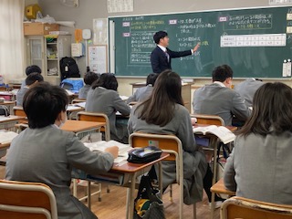 6年生の子どもたちが算数の授業で[反比例]の学習をしています。比例の次は反比例です。今日のめあては[反比例する2つの数量の関係をxとyを使って式に表そう]です。まず決まった数を探し出さないといけません。提示された表から情報を収集して導き出していきます。積極的に発言したり話し合ったりしている場面が多く見られました。今日は教育センターから講師先生にも来ていただいて、教員に指導助言もしていただきます。6年、1年、5年、討議会と続き、今日は一日、研究授業デーとなっています。