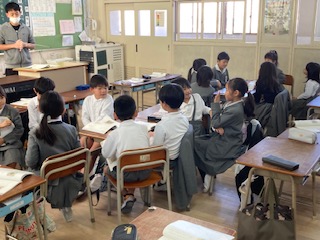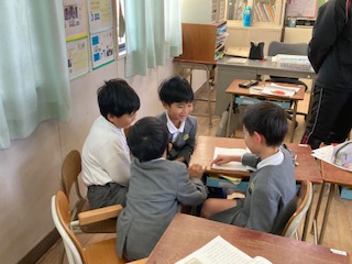 一度ももらったことがないお手紙をずっと待ち続けている[がまがえるくん]に、やさしい[かえるくん]がお手紙を書いてあげるお話です。読み進めていくと、ちょっと心が温かくなります。2年生の国語の教科書に載っています。子どもたちは場面ごとに、がまがえるくんの気持ちやかえるくんの気持ちを想像していました。友だちと輪になって、お互いの考えを交換し合います。子どもたちの素直な思いがたくさん出されていて、授業が活発に進んでいました。