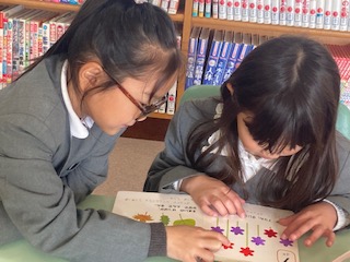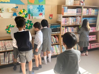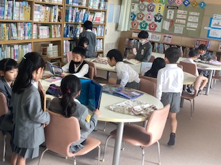 窓から太陽の光が差し込み、図書室の中はぽかぽか陽だまりのように温かくなっていて、とても気持ちいいです。1年生の子どもたちが本を読みにやってきていました。おもしろい本はないかな?たのしい本はあるかな?お友だちと一緒に探したり読んだりしています。冬休みに向けて借りる本も探さないといけませんね。