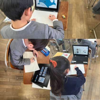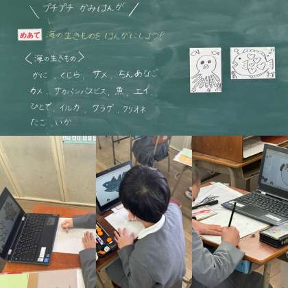 『うみのいきものをはんがにしてみよう!』というめあてのもと、それぞれがパソコン等を使って下絵を描いていました。