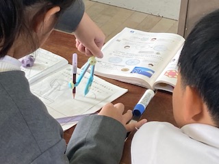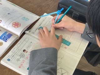 5年生の子どもたちが算数の授業で正多角形について学習しています。今日のテーマは[正五角形を作図しよう]です。どうやって作図したらいいのか、みんなで話し合いました。ちょっと難しそうです。わかっていても上手に説明することができません。でも少しずつみんなで解決していきます。まず円を描いて…、円の中心のまわりは360°だから…、5等分すればいいのかな…、え〜と一つの角の大きさは…、線で結んで…。コンパスと分度器を巧みに使いながら…、でもちょっとズレちゃったよ。これって正五角形かな。まあなんとなく正五角形でしょ。いやいやもう少し正確に…。みんなちゃんとした正五角形が描きたくて一生懸命になっていました。