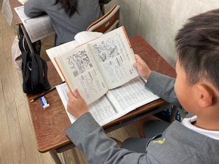 4年生の国語の学習に[百人一首]が出てきます。短歌は五・七・五・七・七の三十一音で表わされる短い詩で、千年以上前に日本で生まれました。百人一首は昔の有名な短歌を百首集めたもので、今でもかるたの形で多くの人に親しまれています。毎年、4年生の子どもたちは一生懸命に覚えたり百人一首大会を開いて楽しんだりしています。今日は先生に百人一首が全部載ったプリントを配ってもらいました。その中から印象に残ったものやお気に入りのものを見つけて、その理由を書いたり発表したりしました。短歌をリズムをつけて詠むのははじめ少し恥ずかしい感じがしましたが、だんだん楽しくなってきましたよ。