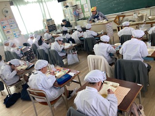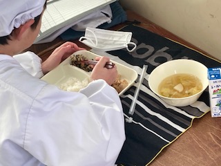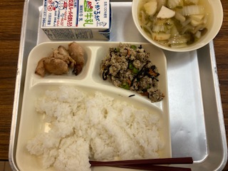 今日の給食のメニューは、鶏肉の甘みそ焼き、五目汁、高野豆腐のいり煮、牛乳、ごはん、でした。鶏肉の甘みそ焼きは鶏肉に料理酒、砂糖、みりん、しょうゆ、赤みそを合わせて下味をつけたあと、焼き物機で香ばしく焼き上げています。五目汁は透明感があり、味にも深みが感じられました。高野豆腐のいり煮は豚ひき肉を加えて旨みを出し、にんじんとグリンピース、ひじきを加えることで彩りをよくしています。少し甘めでおいしかったです。