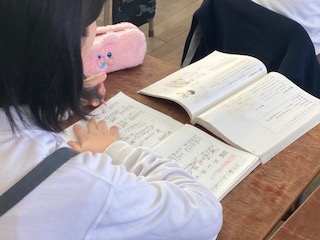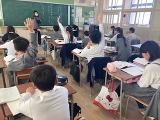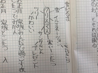連想メモ…。あるワードから思いつくものをどんどん書き足して、世界を広げていきます。例えば『クリスマス』から連想するものは何か、またそこからさらに考えられるものは何か、どんどん広げていきます。できた連想メモを使って表現を工夫しながら、自分の心が動いたことを短歌に表すという学習で、5年生の国語の授業です。子どもたちは自分で考えたテーマをもとに連想メモづくりに取り組んでいました。みんなで一つのテーマでやってみると、おもしろい意見やなるほどと思う意見がたくさん出てきて楽しいと思いました。