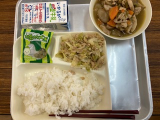 今日の給食のメニューは、筑前煮、ツナとキャベツのごま炒め、抹茶大豆、牛乳、ごはん、でした。筑前煮は鶏肉を主材に、れんこん、ごぼうなどの野菜を炒め、味つけして煮含めた福岡県の郷土料理です。ツナとキャベツのごま炒めは油で炒めたツナとキャベツを塩、こしょうで味つけし、最後にいりごまを加えています。抹茶大豆は大豆を抹茶の粉末でコーティングしてありました。