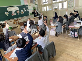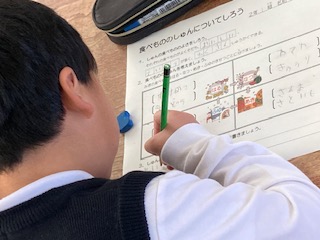 他校から栄養教諭に来てもらって、2年生の子どもたちに栄養指導を行いました。テーマは[食べ物の旬(しゅん)について知ろう]です。旬って何かな?先生に旬について教えてもらいました。それぞれの食べ物がよく育ってとてもおいしい時期、栄養が多くてたくさん収穫できる時期です。先生から問題が出されました。春、夏、秋、冬…旬はいつかな。キャベツは?たけのこは?すいかは?トマトは?きゅうりは?さつまいもは?さんまは?はくさいは?みかんは?だいこんは?さといもは?『えー!いつだろう!?』
