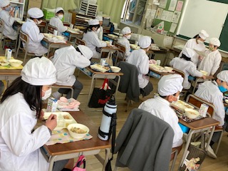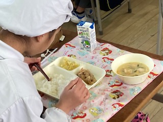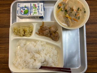 今日の給食のメニューは、鶏肉の甘辛焼き、かす汁、栗きんとん、牛乳、ごはん、でした。鶏肉の甘辛焼きは醤油ベースの甘めのタレで鶏肉に下味をつけて、たまねぎと一緒に香ばしく焼き上げています。かす汁は酒かすの働きで体が温まるので冬に食べられることが多いです。具だくさんで、さけ、こんにゃく、うすあげ、だいこん、にんじん、青ねぎが入っていました。栗きんとんは煮くずれるまでやわらかく煮たさつまいもに栗を加えて、砂糖とみりん、塩で味つけしてさらに煮含めています。甘くておいしかったです。