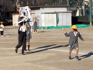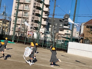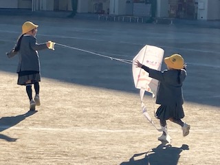 1年生の子どもたちが元気に運動場を走り回っています。たこあげです。自分たちで作ったたこをあげていました。『あがったーっ!せんせーあがったよ、見て見てー!』…、子どもたちがうれしそうに叫んでいます。でも走るのをやめてしまうと、たこが落ちちゃうので止まれません。体力が続く限りずっと走り続けなければいけない1年生の子どもたちでした。それと2人組になった友だちのたこを持ってあげて一緒に走ってあげるのですが、いつまでもたこをはなさずにずっと2人で走り続けている子たちが何組もいて笑ってしまいました。