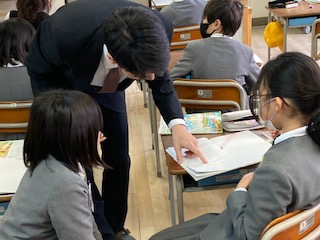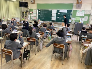 3年生の算数の授業です。小数と小数は比べることができたし、分数と分数も比べることができたね。今日は小数と分数を比べます。0.2と4/10ではどちらが大きいですか。子どもたちは感覚的に4/10の方が大きいと答えます。じゃあどうしてそう考えるのか説明してください。子どもたちは静かになってしまいました。理由をしっかりと考えて理解を深める学習です。子どもたちはこの問題を解決するために見通しを立てて、お互いの発表を聞き合いながら学習を進めていました。体を使って不等号で表したりもしていました。