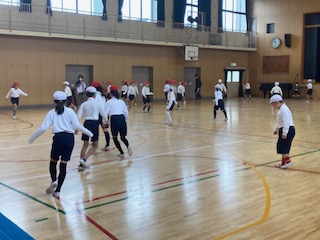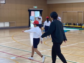 3年生の子どもたちが体育の授業の前に[ライン鬼ごっこ]をして楽しんでいます。この鬼ごっこは体育館のいろんなラインを使って、そのライン上のみを動くことができる鬼ごっこです。バランスをとりながら、うまく鬼と出会わないように動く先を予測して逃げ回ります。このような運動遊びは[体ほぐしの運動]と言って、本来のメインの運動に入る前に自然と遊びながら体をほぐしたり気持ちを高めたりすることで、主体的に授業に取り組めるようにするものです。意図的にこのような工夫も取り入れています。