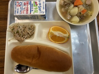 今日の給食のメニューは、ポトフ、ツナと野菜のソテー、いよかん、牛乳、パン、でした。ポトフは肉や野菜をじっくり煮込んだフランスの家庭料理の一つです。大きめの牛肉もしっかりと入っていました。ツナと野菜のソテーはツナとピーマン、もやしを炒めて塩、こしょう、ウスターソースで味つけしています。いよかんは果汁が多くて自然の甘さを感じました。
