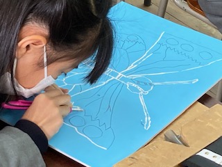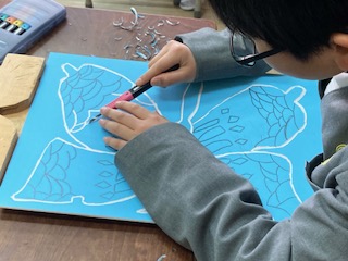 4年生の子どもたちがはじめての彫刻刀にチャレンジです。蝶の絵を描いて、まずは線彫りです。最近の彫刻刀はすべり止めのグリップや刃先の安全ガードなどがついていますが、それでも手を切らないように気をつけて、ゆっくりゆっくり彫っていきます。どの子の横顔も真剣で、みんな全然しゃべらずに集中して手を動かしていました。