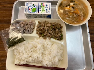 今日の給食のメニューは、鶏ごぼうご飯、みそ汁、焼きれんこん、牛乳、でした。鶏ごぼうご飯は生姜汁で下味をつけた鶏ひき肉とごぼう、こんにゃく、にんじん、グリンピースを使った混ぜご飯です。ごはんと合わせて食べます。みそ汁は豚肉が入っているので豚汁風でした。焼きれんこんはシャキシャキとした食感が楽しめました。