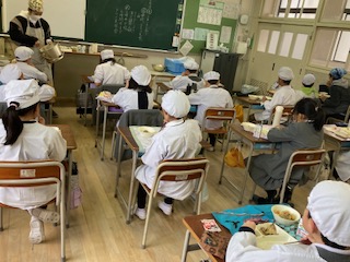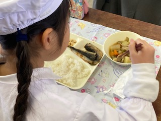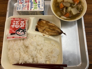 今日の給食のメニューは、いわしの生姜醤油かけ、含め煮、いり大豆、牛乳、ごはん、でした。いわしの生姜醤油かけは開いたいわしを焼き物機で焼き、生姜の風味をきかせた甘辛いタレをかけています。含め煮は和風仕立ての煮物で、豚肉とじゃがいも、大根、にんじん、ごぼう、しめじ、さんどまめが入っていました。どの食材にもしっかりと味がしみ込んでいておいしかったです。いり大豆は小袋に入っています。今日は[節分]の行事献立でした。