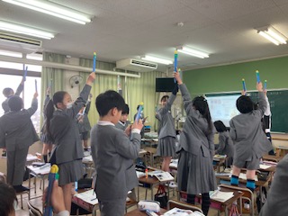 4年生の子どもたちが青い棒のようなものを天井に向けてかざしています。一瞬、変身しているのかと思いました。(ウルトラマン?)温度計でした。理科の実験で[空気の温まり方]について調べていました。空気はどのように温まっていくのか調べるために、暖房している教室で上の方と下の方の空気の温度を計っているのでした。計る場所によって違ったのですが、上の方が下の方よりも1〜3度高いという結果が出ました。線香のけむりなども活用して、空気は水と同じように、温められた部分が上に動いて全体が温まっていくことがわかりました。