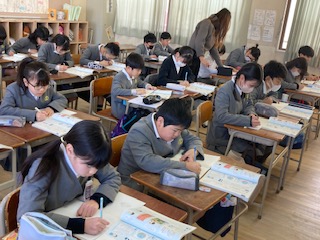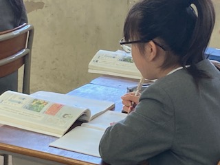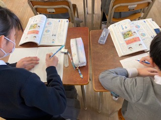 5年生の国語の授業です。内容は[資料を見て考えたことを伝えよう]です。教科書には、大きな社会問題の一つになっている『食品ロス』が取り上げられており、資料としてグラフや表、ポスターや写真、各種の数値などが提示されています。その他に先生からも情報が与えられました。子どもたちはそれらからわかったことを書き出し、資料と関連づけて伝えられるよう整理していきます。5年生も終わりに近づくとなかなか難しい内容になってきますね。さすが4月からは6年生です。