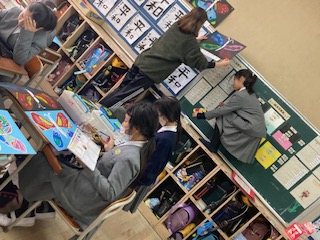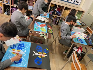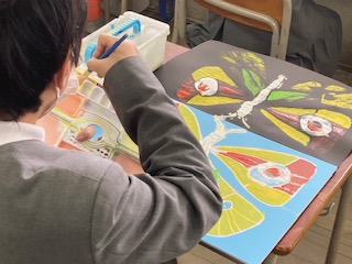 4年生の子どもたちのカラー版画が少しずつできあがってきました。カラー版画は一色ずつ絵の具を塗っては画用紙をかぶせて色をうつし、それを何度もくり返して進めていきます。一気に完成するのではなくて、少しずつできあがっていくので、そこもカラー版画の楽しみなところの一つです。もうすぐみんなのあざやかなチョウがひらひら舞い飛びますね。先生ができた子たちの作品から順に掲示していました。