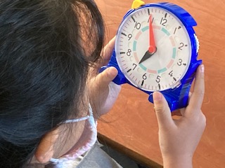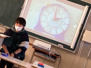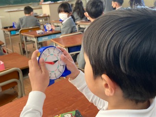 1年生の子どもたちが手に時計を持っています。6じ55ふんです、2じ50ぷんです、1じ58ふんです…。自分で時計の針を動かしては、何時何分か読み取っていきます。お互いに問題の出し合いっこもします。先生も黒板のシートに時計を映して問題を出していきます。子どもたちは勢いよく手をあげて答えていました。何時何分…、もう完璧に言えそうですね。