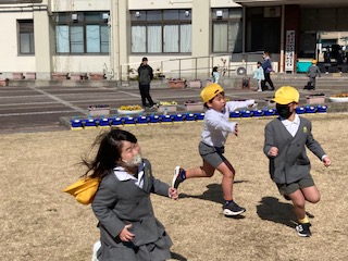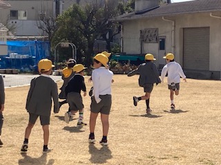 芝生広場で2年生の子どもたちが10人ほど集まって、おにごっこをしていました。明るい陽射しが降り注ぎ、ぽかぽかあたたかいのでとても心地いいです。元気に走り回っている子どもたちの姿が太陽の光と合わさってキラキラ輝いて見えました。立春も過ぎて、少しずつあたたかい春に向かっているのが感じられる休み時間のひとときでした。