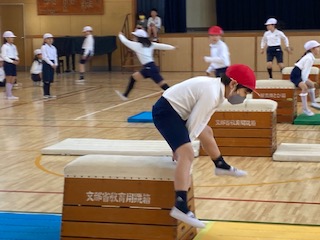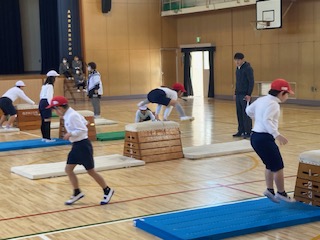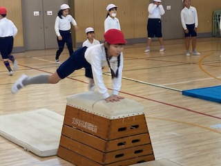 軽快な助走から勢いよく足を踏み切って、タッ!とジャンプします。3年生の子どもたちが体育館で跳び箱運動をしていました。手のつく場所や着地の姿勢などにも気をつけながら、何回もテンポよく跳んでいきます。跳び切れなくてお尻がドンと跳び箱の頭に座ってしまうこともあるけれど、そんなこと気にしません。少しずつ前へ前へと距離がのびて、そのうち跳べるようになります。何度もチャレンジすることが大事です。