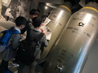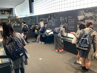 6年生の子どもたちが社会見学に来ています。午前中に[ピースおおさか]を見学し、午後には[大阪歴史博物館]を見学します。まずはピースおおさかです。大阪空襲を中心に戦争の悲惨さを伝える資料や写真、展示物がたくさん置いてあります。まずは1トン爆弾や焼夷弾のレプリカを見て、これが落ちてきたのかと驚いていました。教室ではどうしても教科書中心の学習となってしまうので、この見学を通していろいろなことを感じてほしいなと思います。