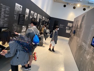子どもたちは館内の資料や写真、展示物をゆっくりとていねいに見て回っています。改めて知ったことや思ったこと、感じたことなども進んでメモしていました。実話を題材にした大阪空襲の映画も全員で観ました。アニメーションなので表現が幾分控えめとはいえ、戦争の恐ろしさが十分に伝わってきました。子どもたちも『怖かった』『絶対に体験したくない』と感想をもらしていました。まだ見学時間はあるのでしっかりと勉強してほしいと思います。