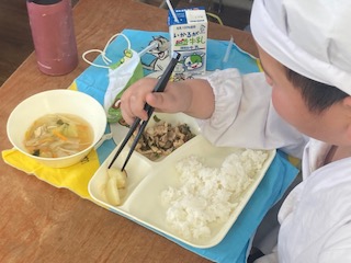 今日の給食のメニューは、豚肉と干しずいきのみそ煮、すまし汁、揚げ焼きじゃが、牛乳、ごはん、でした。豚肉と干しずいきのみそ煮は豚肉の旨みと赤みその風味がしっかりと味わえ、ずいきの食感が楽しめました。干しずいきは里芋の葉柄のことで、カルシウムや鉄分、食物繊維が多く含まれています。すまし汁は透明感があり、彩りもきれいでした。揚げ焼きじゃがは下味に使用する油を増量することで揚げ焼き風にしています。