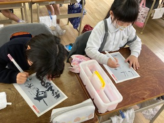 2年生の子どもたちが絵の具をしているのかなとのぞいてみたら違いました。水書きシートと水書筆を使って毛筆体験です。3年生から毛筆の学習が始まりますが、その前にちょっと試してみようということです。何とこの水書きシートが2年生の書写の教科書に付属しているのですね。それを切り取って使っています。昔はそんなのなかったんですけどね。今はすごいですね。子どもたちは何度も字や絵をかいては乾かしてを繰り返しながら楽しく遊んでいました。
