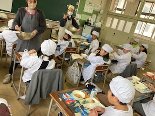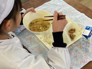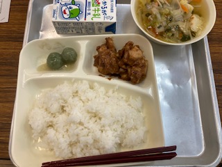 今日の給食のメニューは、鶏肉のみそバターソース、五目汁、きな粉よもぎだんご、牛乳、ごはん、でした。鶏肉のみそバターソースは焼いた鶏肉に八丁みそとバターで作ったソースをかけています。とろみがあり濃厚で美味でした。五目汁はだしがしっかりととられていて味に深みがありました。きな粉よもぎだんごはきな粉をかけて食べました。よもぎだんごは草だんごとも呼ばれ、よもぎはキク科の植物で春に生える若い芽の部分を食べます。